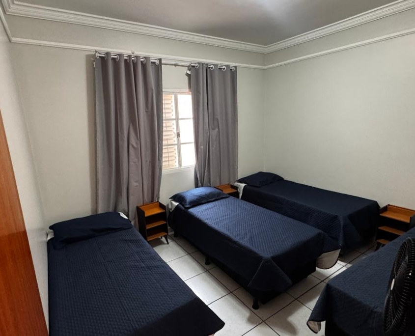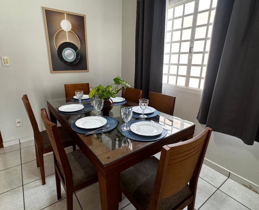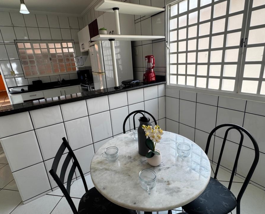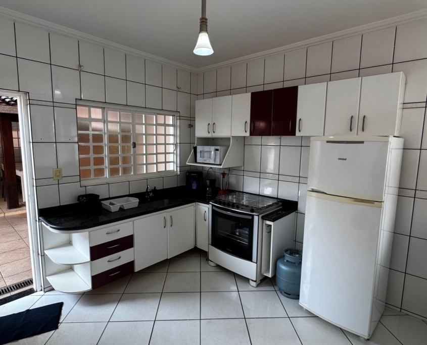 Casa com 3 quartos sendo 1 suíte, 1 banheiro social, sala de TV, cozinha completa, área de serviço com tanquinho e garagem para 1 carro. Equipada com camas forradas, geladeira, fogão, microondas, purificador de água, utensílios de cozinha, ventiladores em todos os quartos e internet Wi-Fi. Acomoda até 8 pessoas.