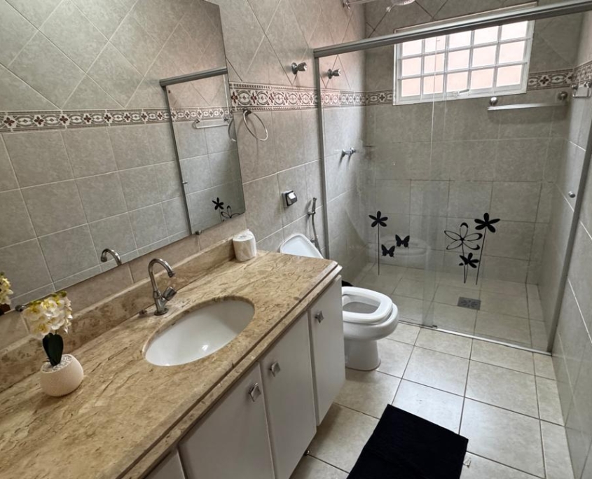 Casa com 4 quartos, sendo 2 suítes, 1 banheiro social, sala de TV, sala de jantar, área de serviço com máquina de lavar, garagem para 3 carros com portão eletrônico. Equipada com camas forradas, geladeira, fogão, microondas, utensílios de cozinha, ventiladores em todos os quartos e internet Wi-Fi. Acomoda até 12 pessoas.