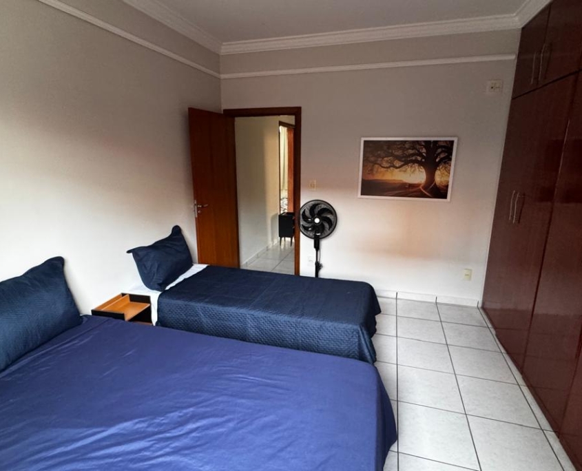 Casa com 5 quartos sendo 2 suítes, sala de TV, 1 banheiro social, cozinha completa, área de serviço com tanquinho, garagem para 2 carros com portão eletrônico, casa monitorada. Equipada com camas forradas, geladeira, fogão, microondas, utensílios de cozinha, ventiladores em todos os quartos e internet Wi-Fi. Acomoda até 12 pessoas.